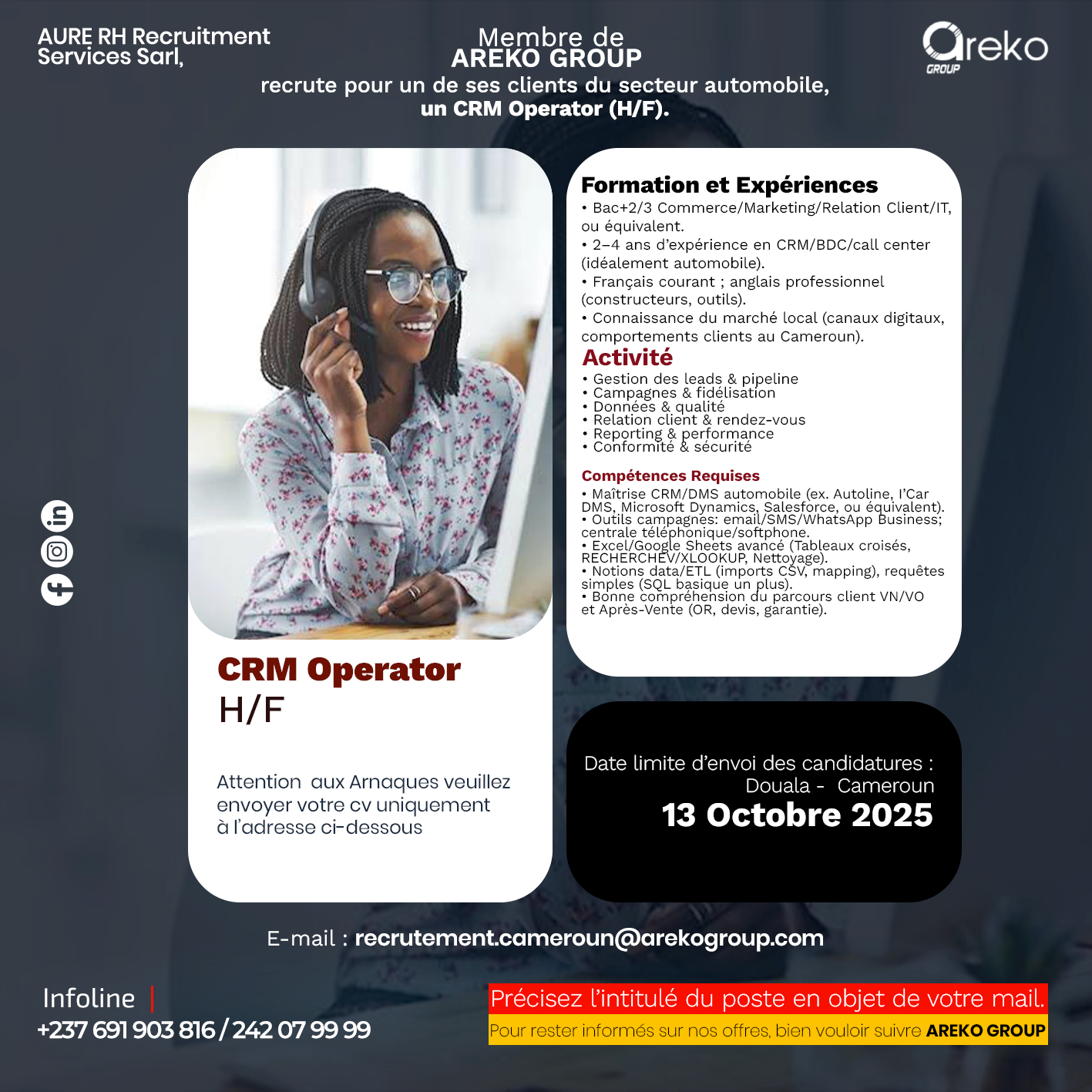 Nous envoyer votre Cv à l’adresse Email : recrutement.cameroun@arekogroup.com