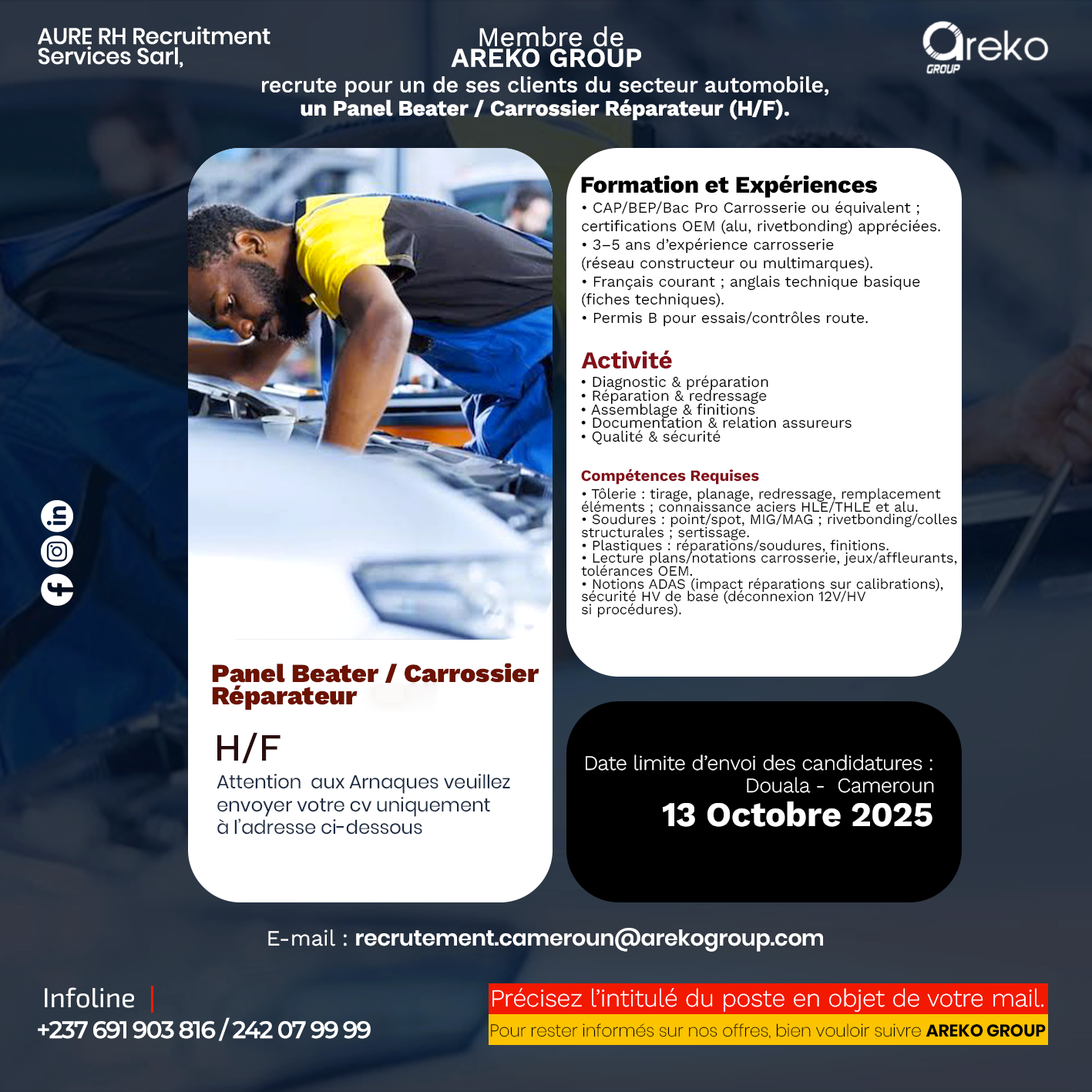 AURE RH Recruitment Services Sarl, Membre de AREKO GROUP, recrute pour un de ses clients du secteur automobile, un Panel Beater / Carrossier Réparateur.