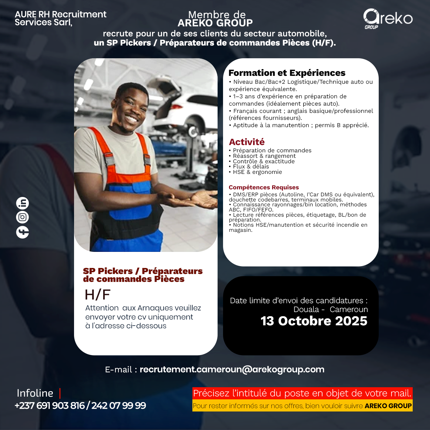 Nous envoyer votre Cv à l’adresse Email : recrutement.cameroun@arekogroup.com