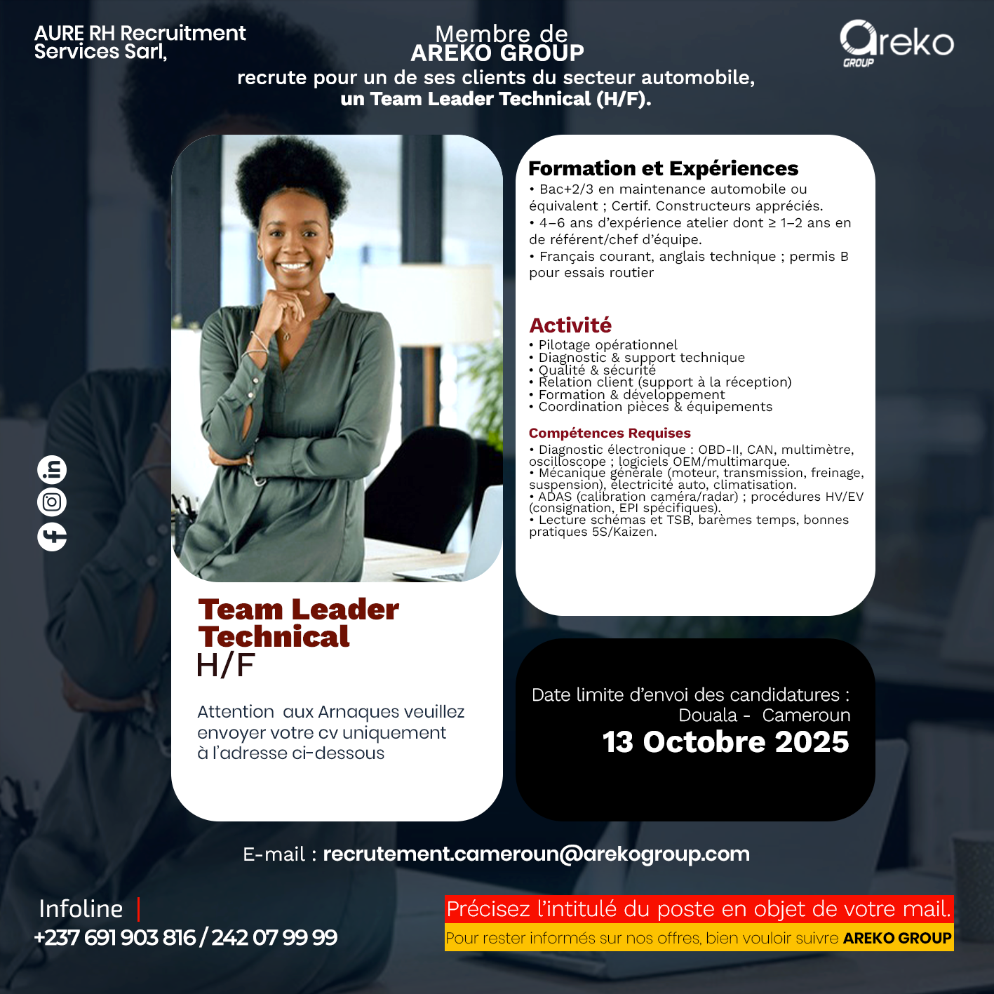 AURE RH Recruitment Services Sarl, Membre de AREKO GROUP, recrute pour un de ses clients du secteur automobile, un Team Leader Technical.